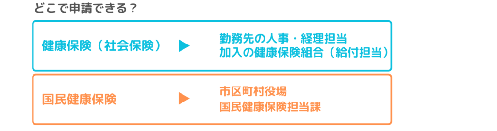 ※大手会社に勤務の方など独自の健康保険組合(⚫︎⚫︎株式会社健康保険組合など)の方は、該当の健康保険組合や共済組合に申請します。もしくは、会社の健保担当の方に聞いてみるのも⭕️